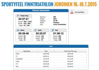 Joka kyllä huomattiin. Ja voi tsiisus mikä fiilis. Alitin 5 tuntia. Loppuaika taukoineen 4:57:12Voi Juma mikä temppu. Murskasin kaikkien 3 lajien ennätykset minuutti tolkulla! Uinti oli noin minuutin, pyörä 12 min ja juoksu 5 min nopeempia kuin edelliset puolikkaan parhat ajat! Loppuaika parani 26 minuuttia viime vuoden Tahkon puolikkaasta! En ihan uskonut Syyskuussa Bar Edisonin pöydässä Tatun kanssa istuessani, ja alustavaa ohjelmaa tehdessämme että tämä oikeasti toteutuu! Mutta niin vaan kävi. Kova työ palkitaan, ja määrätietoisesti kun touhuaa niin kaikki on mahdollista. Turun Urheiluliitolla oli muutenkin ihan huipuu päivä. Startanneita oli liki 50 ja todella moni teki uusia ennätyksiään tai muuten vaan tajuttumia suorituksia. Kymppisakkiin päästiin useassa sarjassa ja Miesten yleisen sekä M35-39 sarjan voitot tuli Turkuun. Suuret kiitokset Nummen Pyörä, jonka ansiosta pyörä toimi taas kuin kello. Omia tukijoukkoja pysty kiittämään niin paljon kuin haluaisin, mutta korvaan kaiken jossain kohtaa omalla tavallani 😉 Mitäs tästä eteenpäin? Pari päivää lepoa, jotta palaudutaan kunnolla ja saadaan jalat toimimaan normaalisti ilman kipuja ja sitten 4 viikon pääsätä Turussa yritetään mennä vielä hurjempaa kyytiä!. Ja tähtäin on jo siis asetettu IM South Africa kisaan..