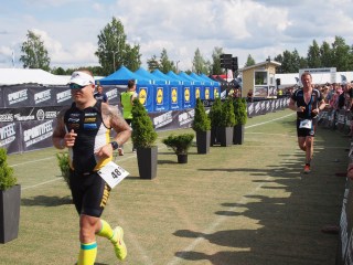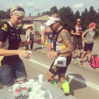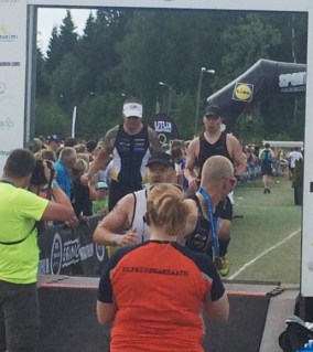 käännyttäessä pieni vauhdin nosto taas. Tasaisella juoksinNiklaksen ohi, läpy olkapäähän ja tsempit. Alamäki, tasainen kurvi oikealle pieni nousu ja viimeinen juomapiste. 2 mukia ja matka jatkui. Silli huusi jotain. En kuullut enää mitään, en nähnyt mitään. Painon määrätietoisesti vaan eteen päin sitä faking ylämäkeä. Ja siinä katsoin ekan kerran kellosta kokonaisaikaa ja tajusin että tavoitteena ollut maaginen viisituntia tulee alittumaan. JUMALAUTA. Nyt kaikki irti. Nostin taas vauhtia kun alkoi metsä osuuden viimeinen tasainen osuus. kaarros vasemmalle ja kuulutukset kuului jo. Loppukiristä ei tietoa, en edes tajunnut mitä olin tekemässä, jalat vaan veivät eteenpäin. Maalisuora, ihmiset mylvivät, musiikki soi ja rampin päällä kyltti Kohta olet teräsmies. Kädet nyrkkii ja ilmaan ja ilmoitin todella voimakkaalla äänellä saapumisestani maaliin. JEEEEEEEEEEEEE!!!!!