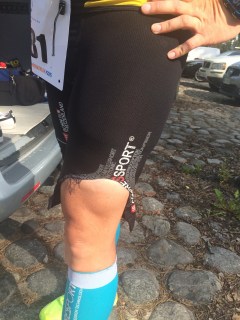 Maalissa pyysin Sarin etsimään sakset tai puukon tai jotain. Monitoimi työkalu löytyi. Lahkeet riekaleiksi, johan paine helpotti. Olisin juoksussakin jo heittä ny pöksyt mettään, mutta munasillaan juoksusta olisi tullut hylky, ja varmaan porttikielto koko loppu sarjaan. Meikäläisen 56cm reisi nyt vaan ei mahdu olemaan tuollaisissa kompressio shortseissa. Ei enää ikinä! Jaloissa on tällä hetkellä tunne kuin olisin eilen ollut rauhallisella pyörälenkillä ja juossut siihen päälle joku 30 min. Eli ei tunnu missään. Kylläsekin kertoo jostain, kun ei kiristä niin kuin kisan jälkeen kuuluisi.