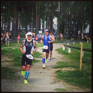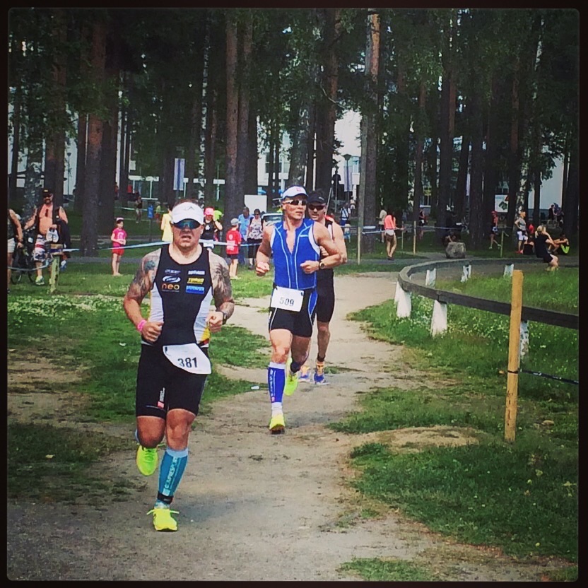 Ylämäkeä tarpomaan kohti vaihtoa. Juuri kun jyrkin osuus oli suoritettu ja meinasin ottaa ensimmäisen juoksuaskeleen kävelyn sijaan Maria huusi aidan takaa Ei täällä jumalauta kävellä, Juokse juokse! Pyysin anteeksi huonoa käytöstäni ja aloin juoksemaan. 🙂 Tsemppauksia on monenlaisia. Kaikki toimii. Kiitos Maria! Takaa kuului hyvä Turku. Fistbumbit siinä ja pari sanan vaihtoa. Se oli Mikko Ovaska. Sama kaveri jonka kanssa poljimme Vanajanlinnassa vuorovedoin pyörän ja hänhän voitti meidän ikäsarjan. Ja voitti myös täälläkin. Onnea!Vaihto sujui ihan ok. Aika hidasta tekemistä muihin nähden mutta ei ongelmia tai muuta sählinkiä.