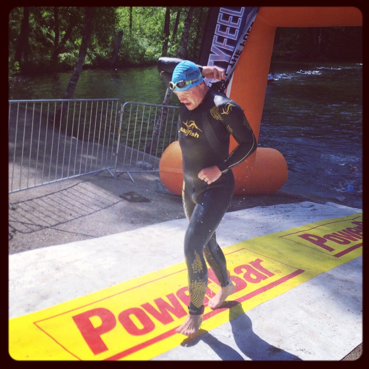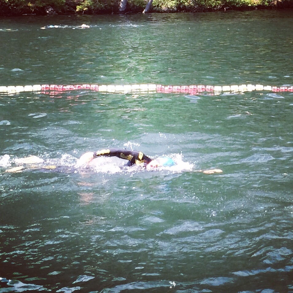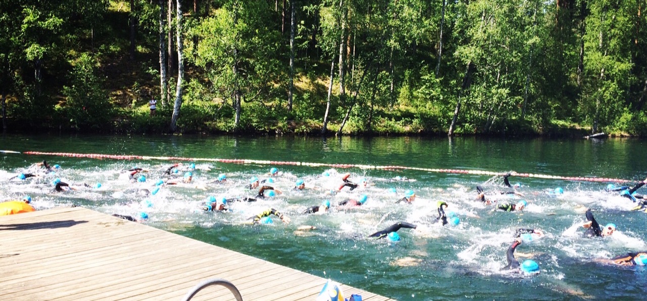 Kohti rantaa ja puku päälle. Pasin ja Jarin kanssa jutustelua ja puvun repimistä päälle. Kuumalla kelillä kun se ei ole niin helppoa kuin luulisi… Hyvissä ajoin veteen lillumista ja pieni pyrähdyksiä. Lähtö tapahtuisi järven toisesta päästä vedestä.