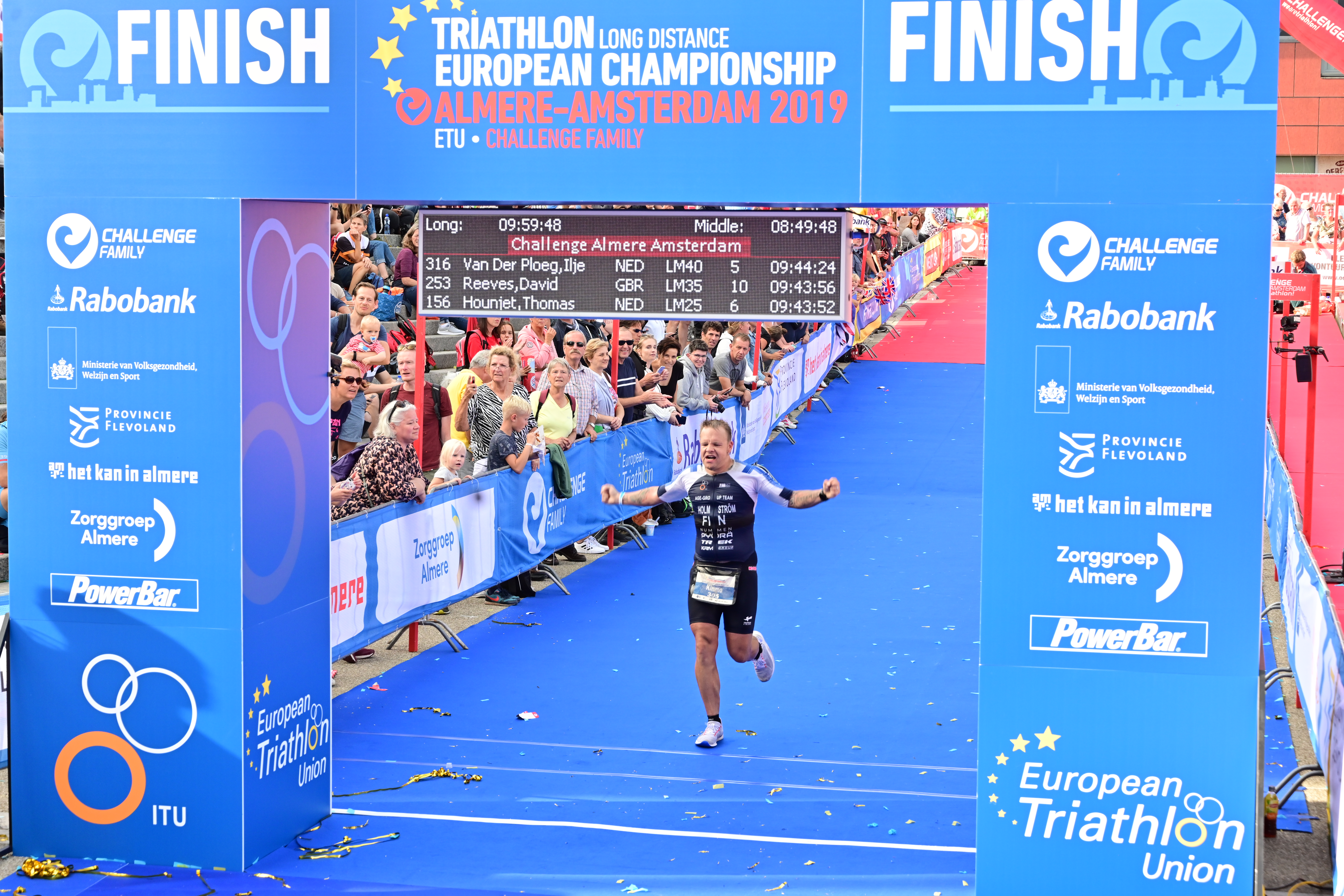 Kierros 5 kierros oli vaikea. Alkoi tekemään hieman jo kipeää. Varsinkin oikeaan etureiteen, kun reitti kiertää koko ajan vasemmalle, ja reitillä on paljon mutkia, niin oikea jalka joutuu tekemään extra duunia. Mietinkin siinä, että häviänkö paljonkin, jos hypin yhdellä jalalla? En sit kuitenkaan kokeillut. Viimeinen geeli oli liikaa ja se alkoi närästää hieman. Ajattelin jos se menee ohi, jos viimisellä pisteellä otan hieman vettä. Ei se sit oikein toiminut. Siinä tulee pieni metsä osuus ennen kuin käännytään takaisin kohti keskustaa, jossa muuten pysähdyin kerran oikein puska pissalle. Samaisessa metsässä sormet kurkkuun ja geeli ulos. Se helpotti ja homma jatkui samaan malliin kuin aikaisemmin. Viimisellä kierroksella annoin itselleni luvan vaihtaa kellosta ruutua ja katsoa kulunutta aikaa. Aloin laskeskella ja tajusin että nyt mennään sub 10 niin että heilahtaa. Muistan että juuri ennen viimeistä juoma pistettä juoksin sellaisen kaverin ohi, jonka perseessä luki Hemmes. Tietämättäni nousin tässä kohtaa sijalle 4. Maaliin on noin n 2 km. Olisin varmaan koittanut juosta hieman ripeämmin nämä viimeiset kilometrit, jos olisin tiennyt, että podium sija juoksee siinä reilun 100m päässä. Koitin kyllä kaikin keinoin tehdä jonkin sortin loppu kirin, mutta nousiko vauhti oikeasti vai kuvittelinko vaan? Oli mahtava tunne juosta viimistä kertaa punaista mattoa pitkin vaihtoalueen ohi Suomen lipun heiluessa tangossa ja kurvata keskeltä toria kohti sinistä maaliporttia. Kädet ilmaan ja tunteet esiin! Organisaatiosta Christiaan de Jong oli suu messingillä mitalli valmiina vastassa ja osoitti tulostaululle. Käännyin ympäri. 9:44:50! Mitä helvettiä. Onko toi mun aika? Jeeeesssss!