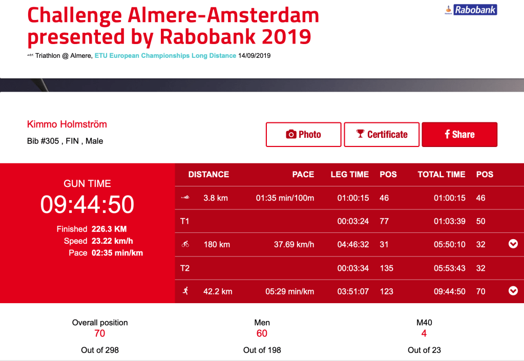 Aivan huikea päivä. Kaikki toimi. Ei mitään ongelmia. Kisaaminen oli helppoa eikä tarvinnut puristaa missään kohtaa. Oma PB parani siis 45 min! Ja joka osa-alueella tuli myös parannusta. Parhaiten juoksussa, 25 min.