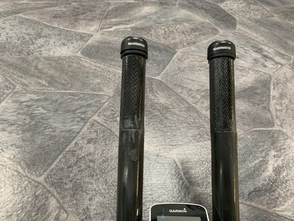 Askartelin tässä pyörän aerotankoihin hieman lisää pituutta. Tykkään Bontragerin monobar systeemistä todella paljon. Vaihtoehtona olisin malli, johon saa mitkä tahansa aerotangot, mutta tykkään tuosta kiinteästä mallista, mutta halusin asennosta hieman pidemmän ja käsillä olisi varaa tulla hieman ylemmäs, jolloin saisin pään aika pitkälti käsin taakse piiloon = as aero as Triathlon Suomi dudes. Tein ensin töissä alumiini putkista testi kappaleet ja kokeilin, tuleeko hommasta ensinnäkään yhtään mitään ja mikä olisi hyvä pituus putkille. Pienen googlettelun tuloksena löysin juuri sopivan kokoista hiilikuituputkea. Putket ovat halkaisijaltaan 18/16mm ja 19/22mm. Pienempi sopii mainiosti Monobaarin sisälle holkkiputkeksi ja 19/22mm putkesta tekisin ulomman putken. Monobar aerotankojen ulkohalkaisija, kun on 22mm ja sisähalkaisija 19mm ja Dura-ace Di2 vaihtajan levein kohta on 19mm, niin tämä olisi perfect match. Putkien sahaus laikalla oikean kokoisiksi, koe kasaus ja pienten viilausten jälkeen koko paketti kasaan Loctite epox liimalla. Voila. Näin saatiin aerotangosta lähes saumattomasti 80mm pidemmät. Ja vaikka itse sanonkin on lopputulos aika hyvä.